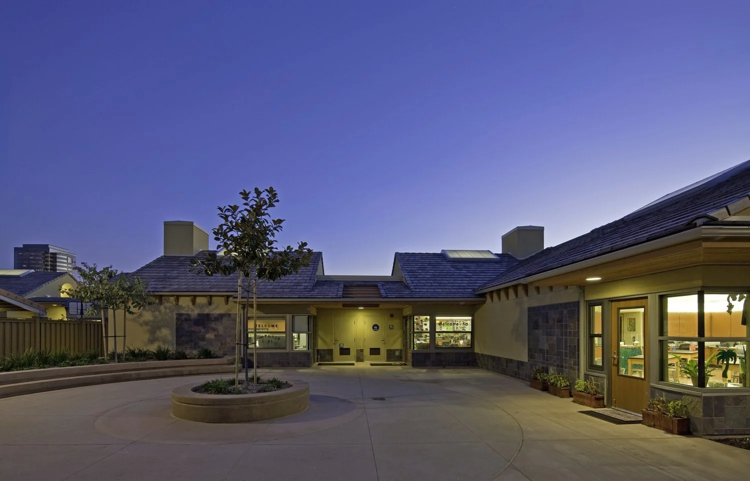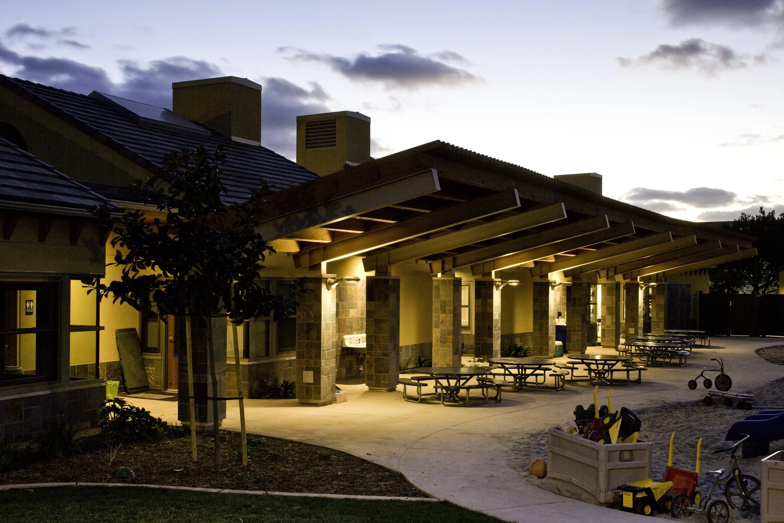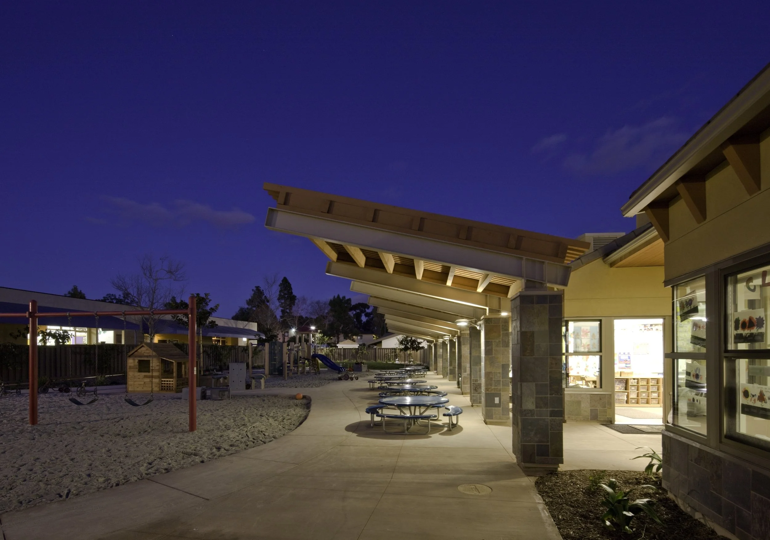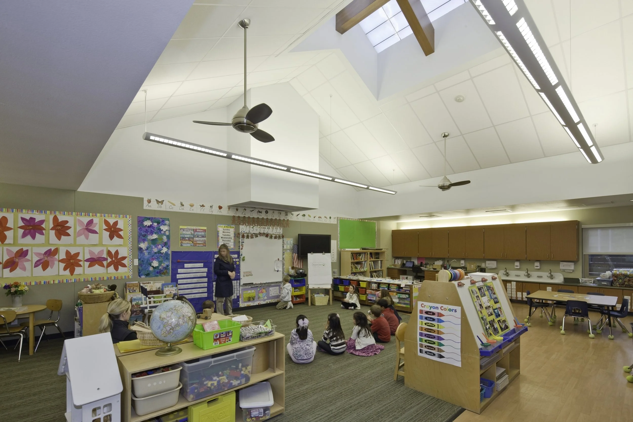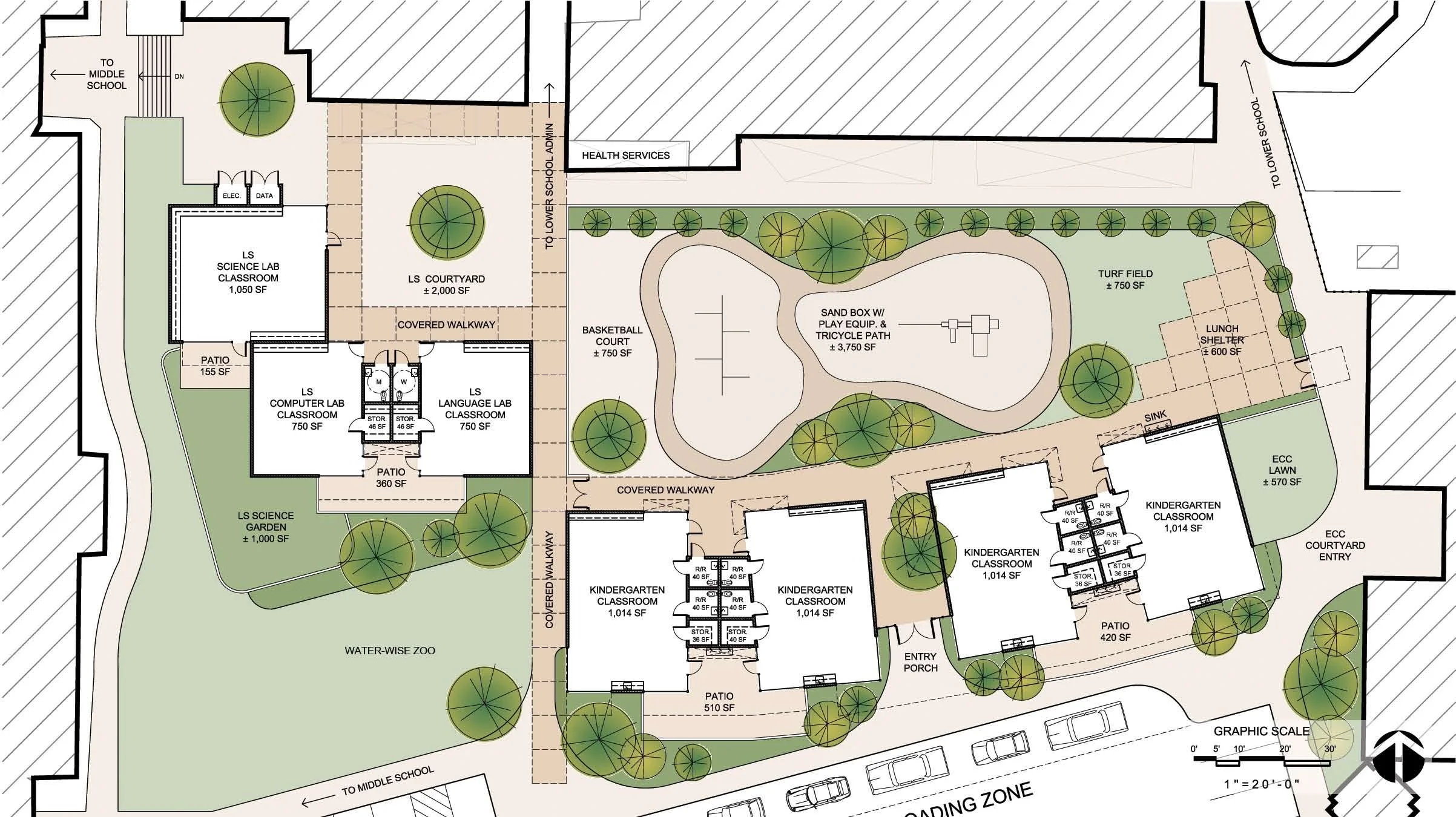 The Kindergarten Center incorporates four classrooms with a play area, three specialized Lower School (grades 1-4) laboratory classrooms, exterior entry and play area improvements to the existing Early Childhood Center, and a 70-space parking lot and loading zone. The Lower School classrooms are organized to create a small courtyard for gathering, and will act as the first phase of future Lower School improvements. The new Kindergarten Center is LEED Gold Certified.