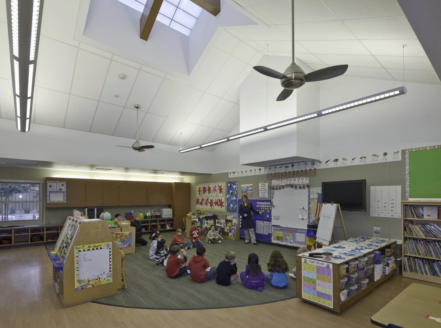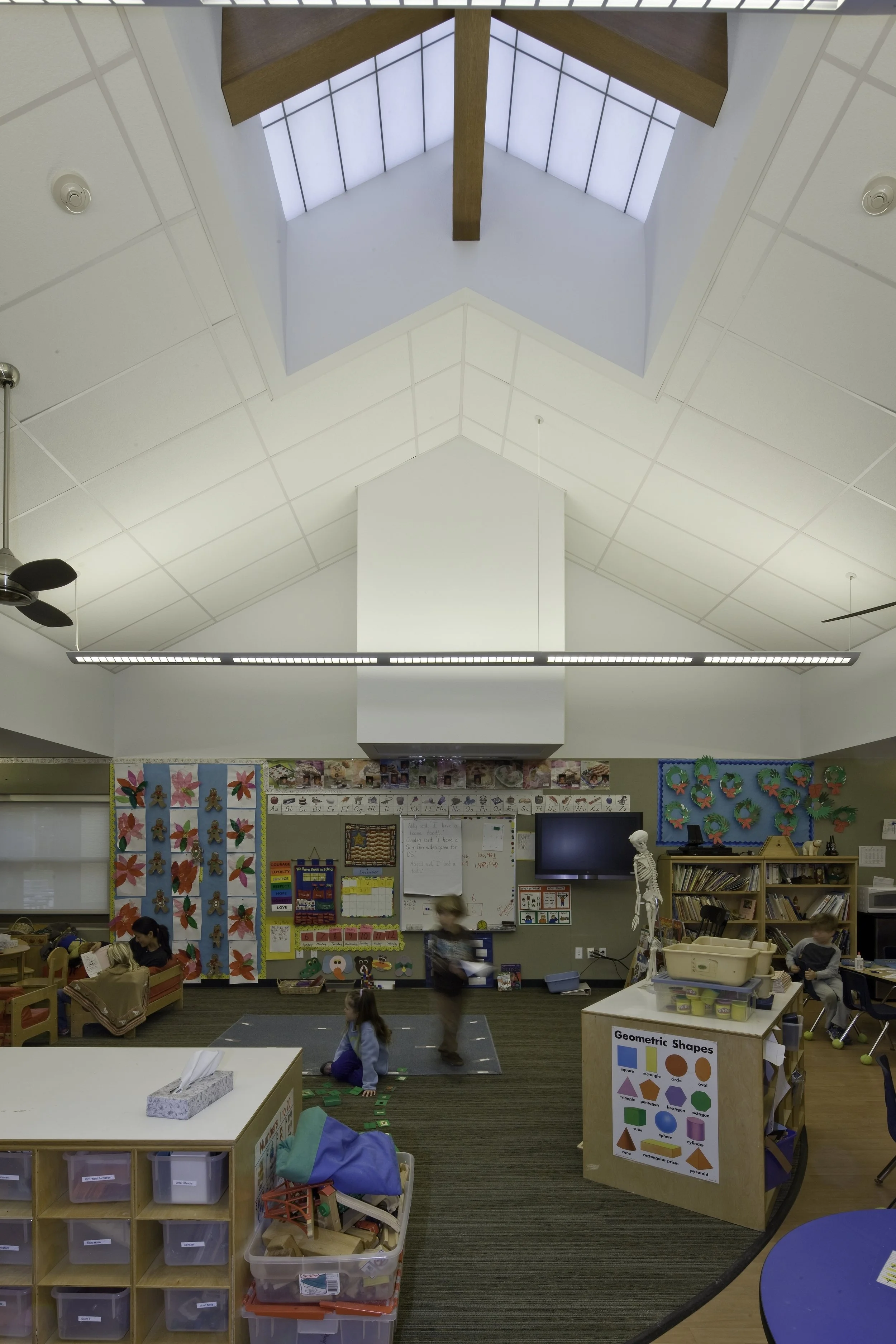 Relating to its surrounding context, the Kindergarten Center and Lower School are designed to bridge the step between day care and first grade, both programmatically and architecturally. With a friendly, “homey” residential aesthetic, the kindergarten classrooms relate to young children in both scale and form. The primary focus of the entire project is the quality of the interior classroom spaces. Designed to optimize daylighting and natural ventilation, the classrooms are also arranged in a functional and economical plan, with adjacent core restroom and storage areas.