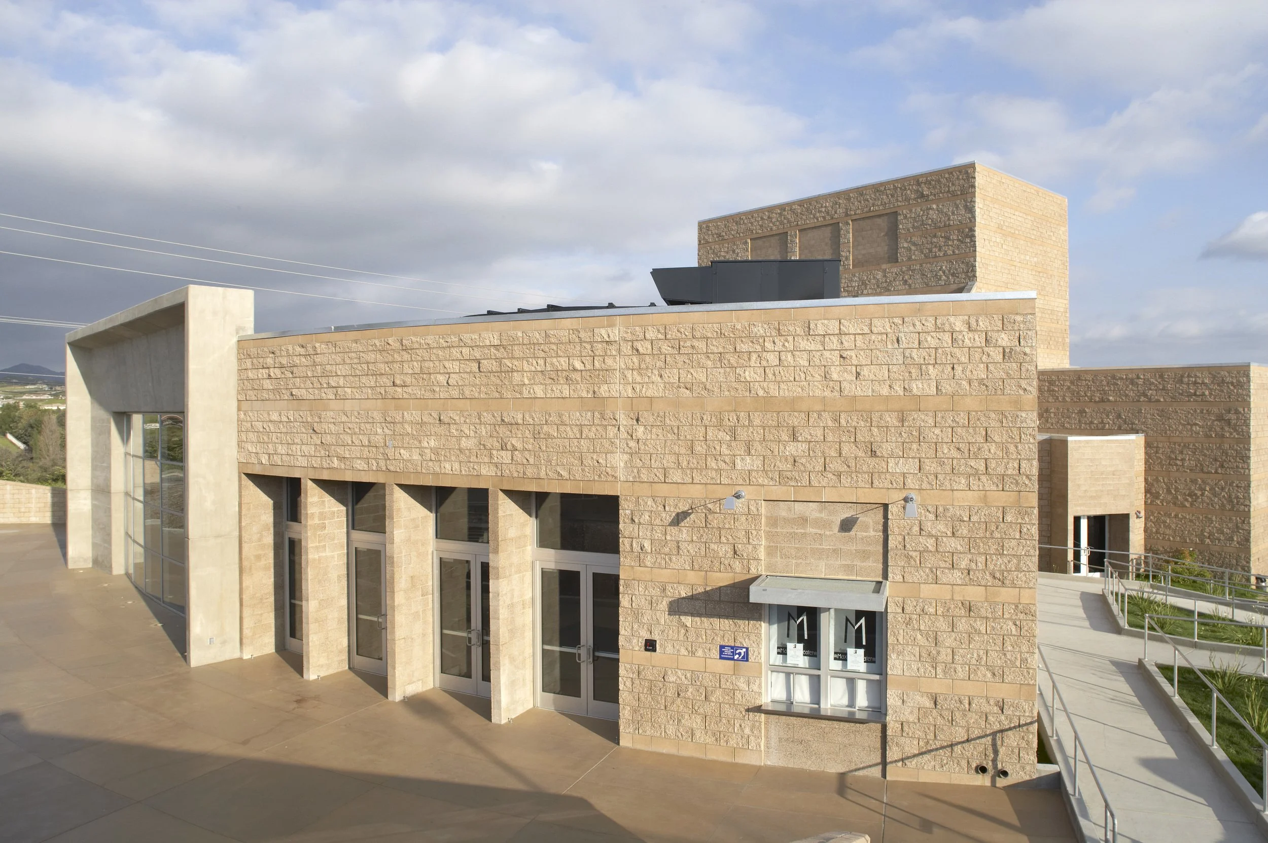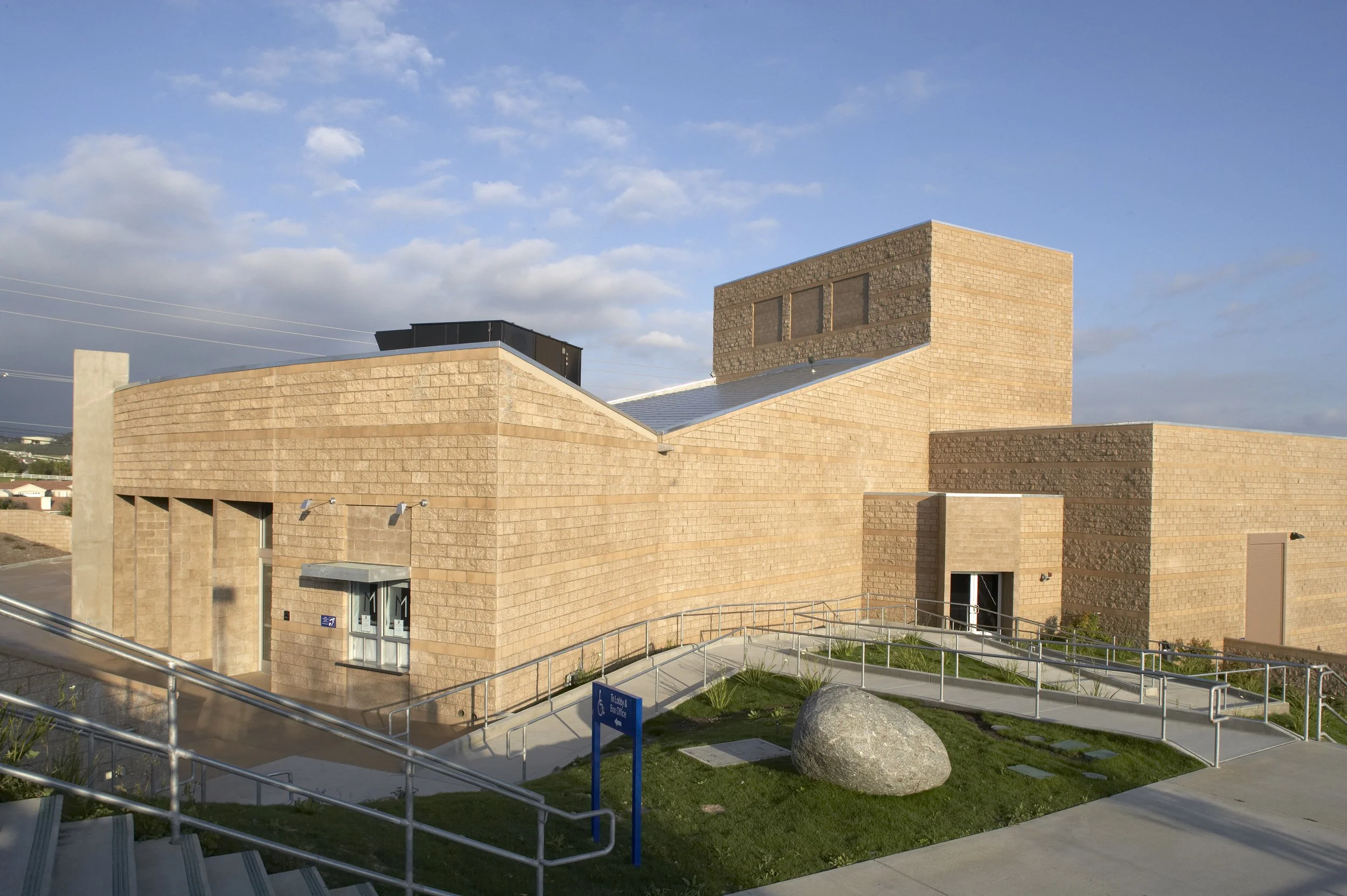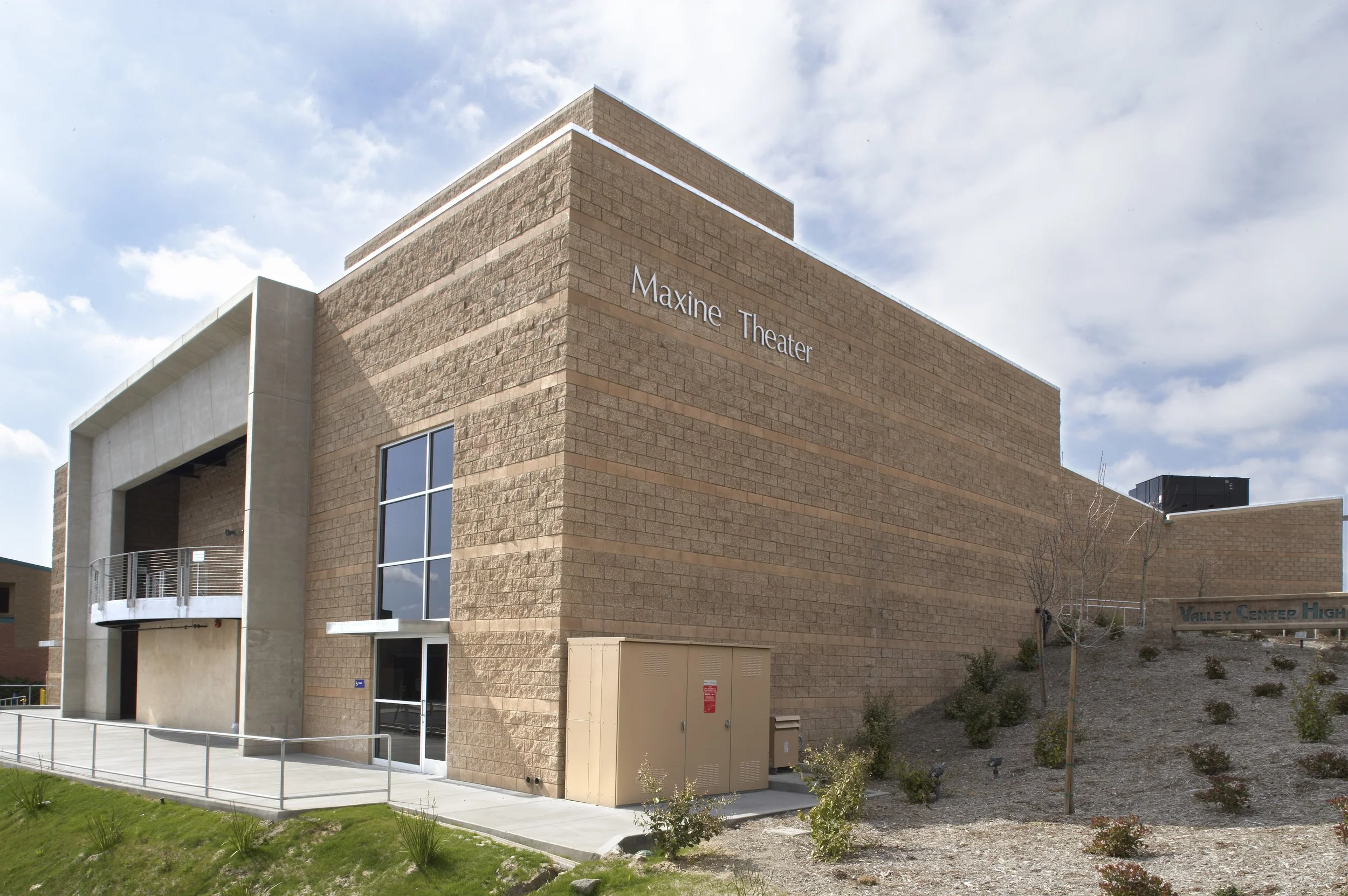 This performing arts center on the Valley Center High School campus is used jointly by both the School District and adjoining community; the project received matching grant monies from the State of California through the San Diego County Office of Education. Designed on two levels, the 575-seat, 18,000 SF theater contains a stage, complete with a fly loft, orchestra pit, and scenery shop, a black box experimental theater classroom, as well as two classrooms, storage, and lobby.