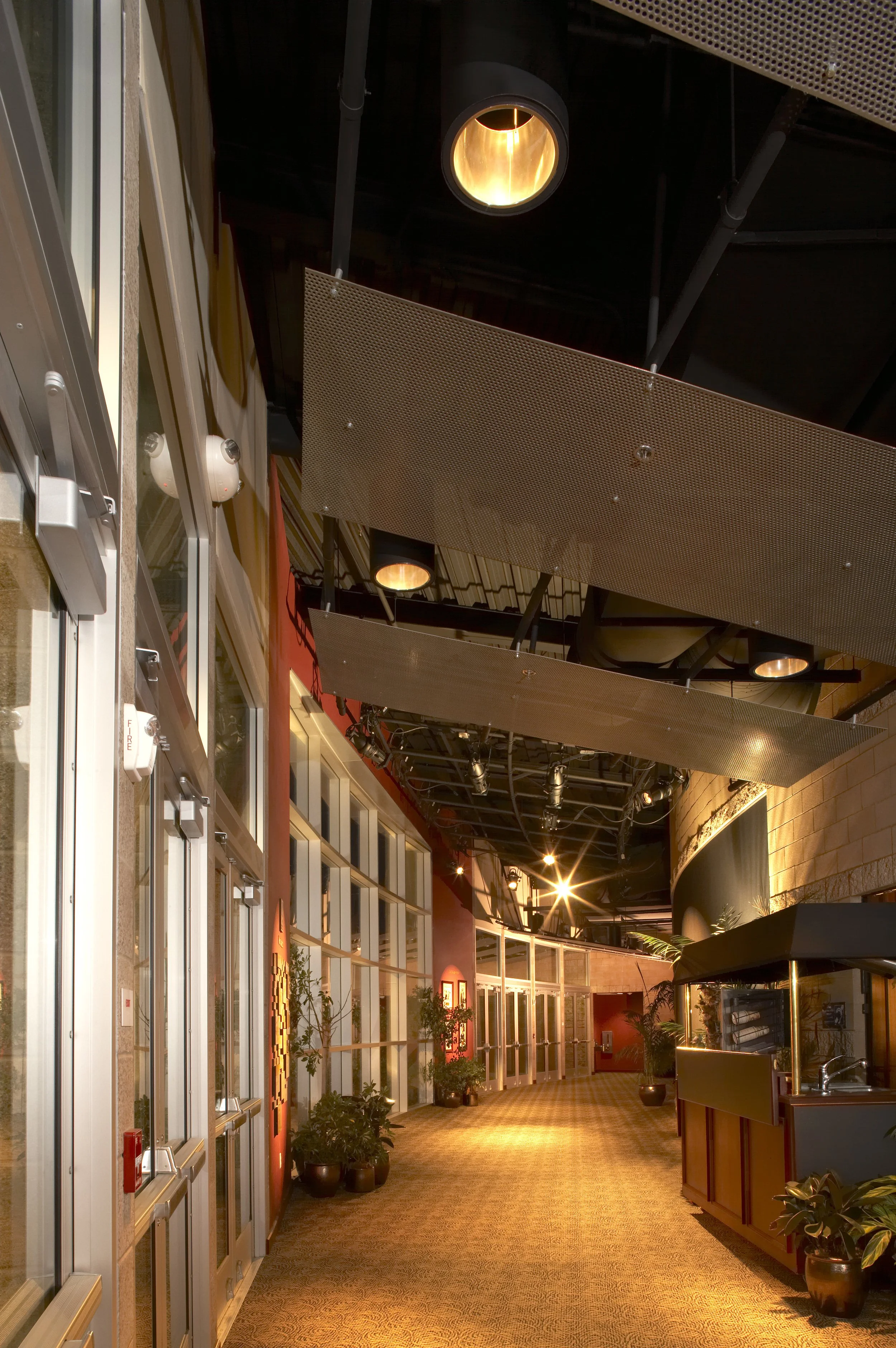 Intended to be used by students and equity performers alike, the theater is equipped with state-of-the-art electronic rigging, lighting, and sound systems. Planned to optimize use of the existing parking facilities and for visibility from the main road, the building fronts a grand landscaped plaza and includes a rear balcony for additional performance and gathering space. The facility was modeled entirely on computer, a process that also yields renderings taken from any viewpoint, as well as an animated fly-by. While assisting the design process, these tools also produced a top quality graphics package that was highly beneficial to the fund raising effort.
