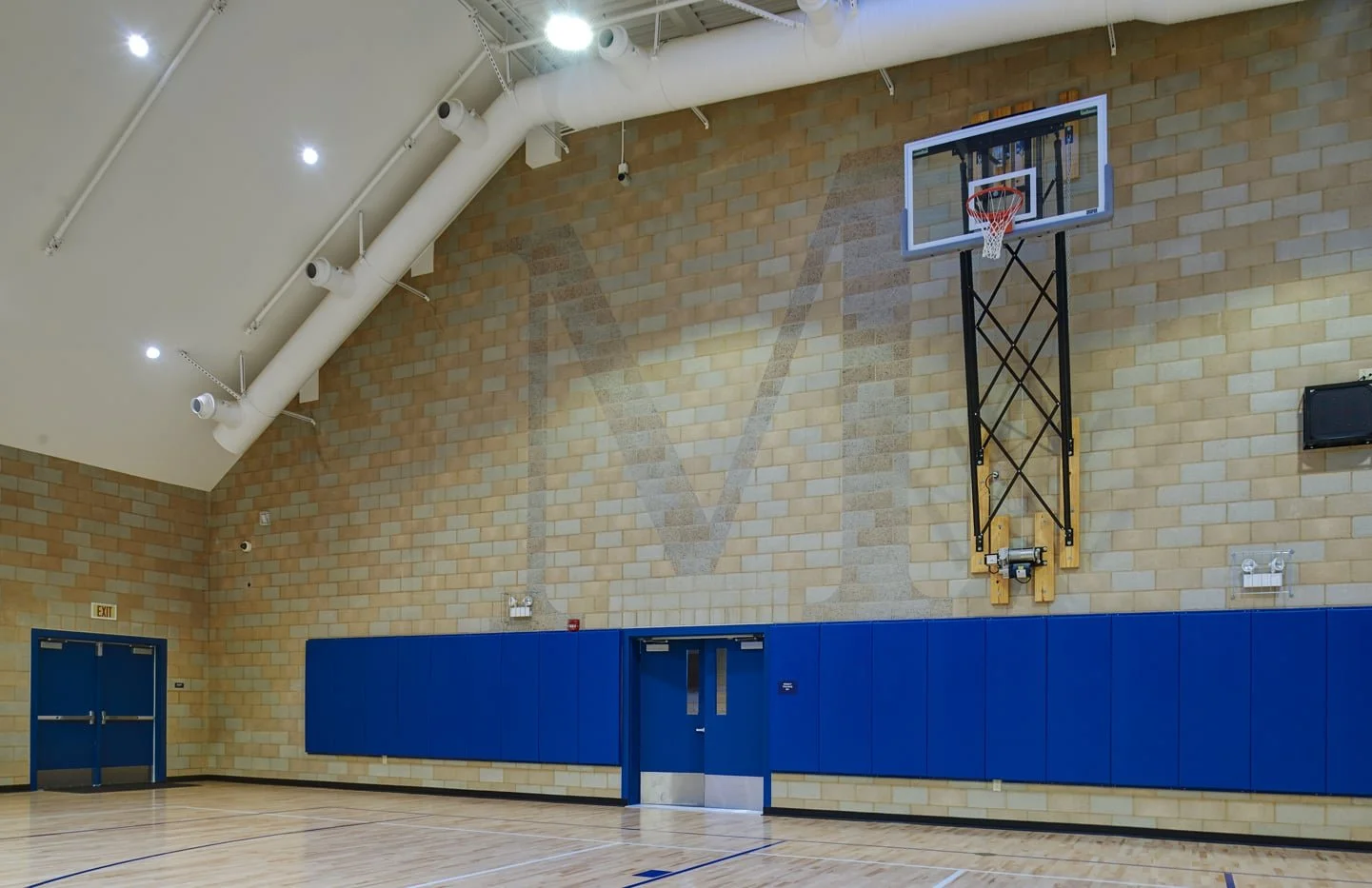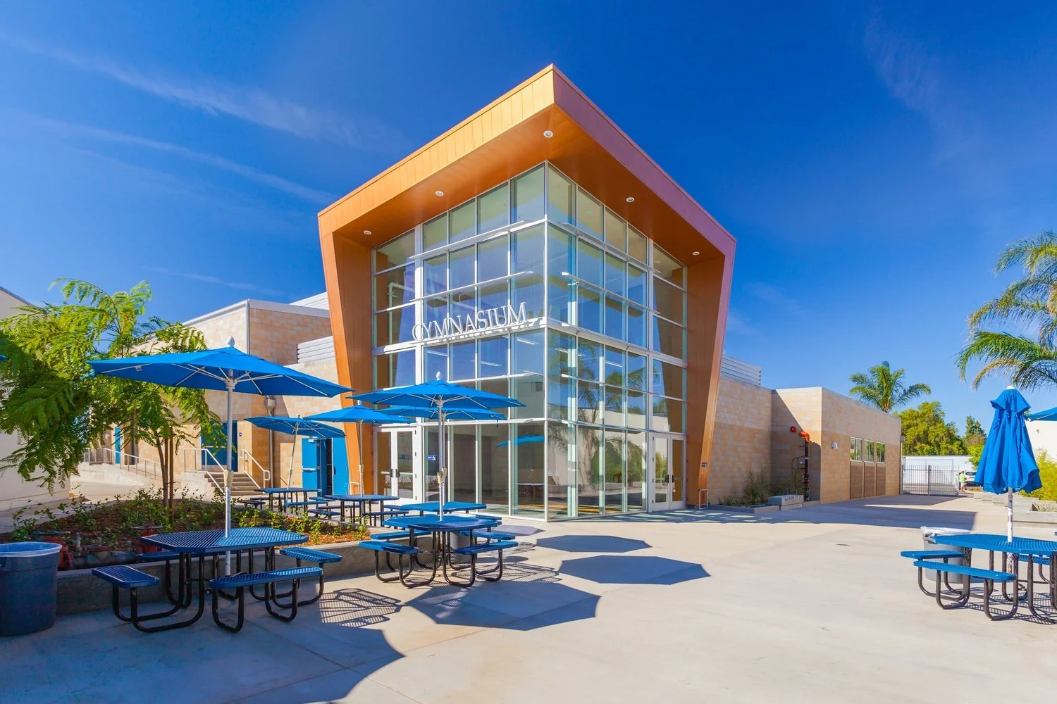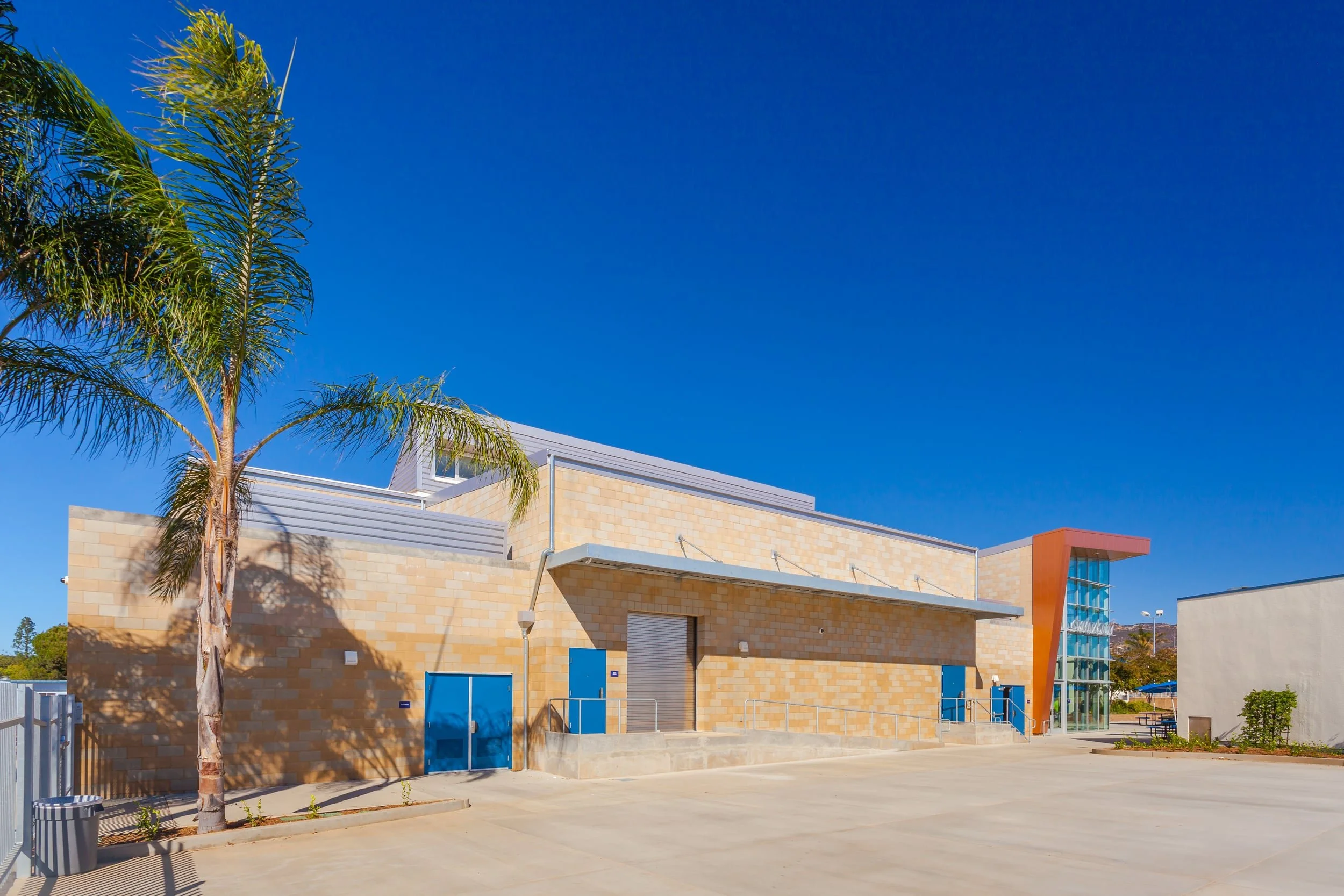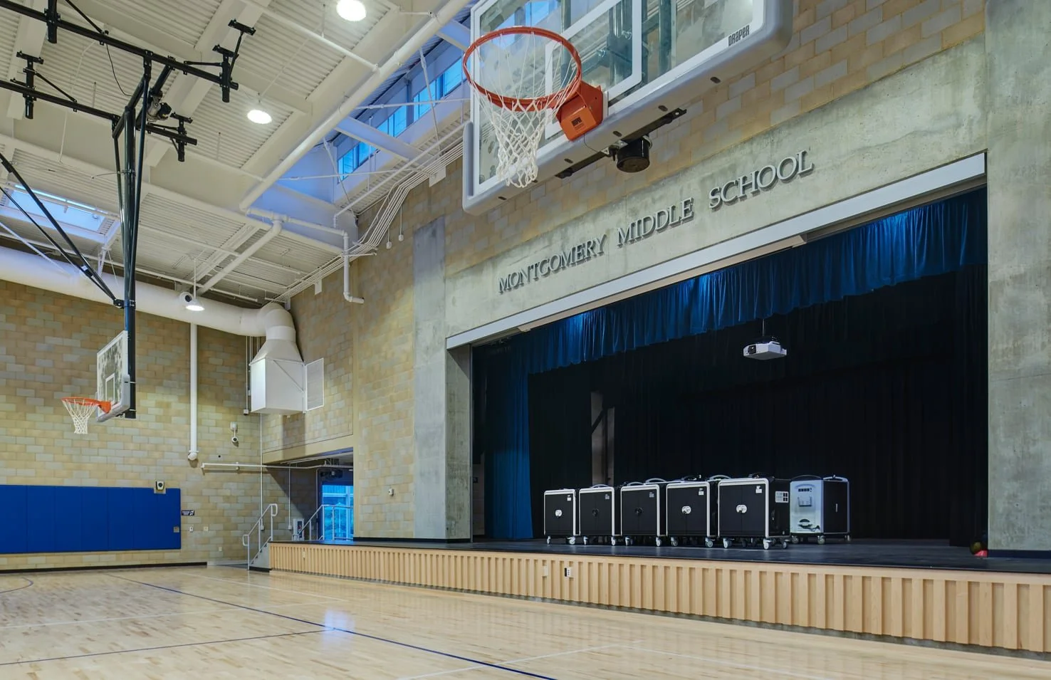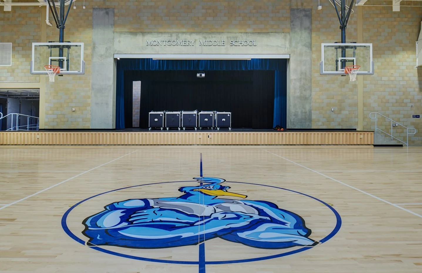 The new 14,000 SF multi-purpose facility at Montgomery Middle School includes a gymnasium with CIF basketball court, a performance platform, telescopic bleachers, a weight room, lobby, and rest rooms.