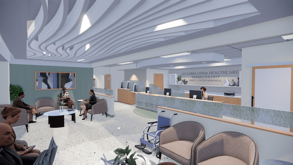 Renovate Surgery Specialty Clinic. Loma Linda, CA. Phased remodel of 11,152-SF of Dermatology Service. New space will include specialty services such as procedural, treatment, and general exam rooms and will utilize the Patient Aligned Care Team (PACT) model.